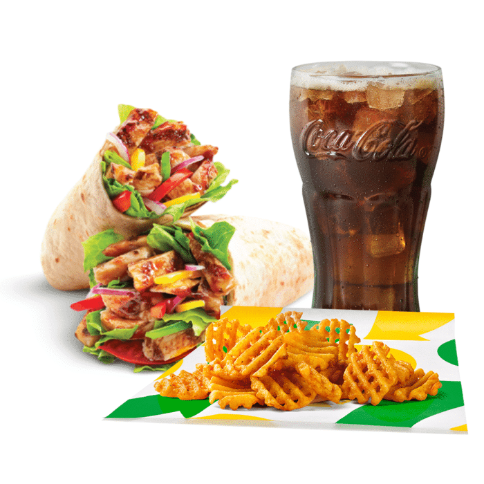 BBQ ქათმის სტრიფსების ვრეპი,waffle fries,კოკა – კოლა